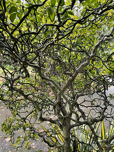 Of the standard fruit-producing citrus, best suited for our cool summers and mild winters is the compact and bountiful Meyer lemon; grow it in a container so you can move it under cover when a deep freeze looms. A relatively new kid on the block, the trendy and zesty yuzu, is the only one in my experience that dwells happily in the ground with no protection required. Before shining the spotlight on these two, let’s consider the merits of ‘Flying Dragon’ —one of the oddest elements of the extended citrus family— grown as an ornamental shrub even though it produces edible fruit.