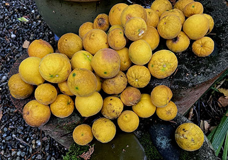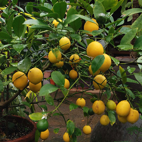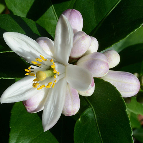 Citrus x meyeri ‘Meyer Improved’ 2 —Most likely an ancient Chinese hybrid of Citrus limon (the standard lemon) and Citrus reticulata (the mandarin orange) the low-growing Meyer lemon is hardier than the former and requires less heat than the latter to produce high-quality fruit. For me it blooms nearly continuously from May to November, with its sweet and super-juicy, thin-skinned lemons maturing from September through March. Although tolerant of light frost, it needs overhead protection in case of a hard freeze. I pull mine under cover at 30° F and drag it inside the house if forecasts call for 26° or lower. Because it languishes if left for long in low-humidity, interior spaces, I mist it regularly and pull it back outside as soon as conditions permit. This is a hungry plant: I feed it three or four times a year with organic citrus fertilizer (NPK content 6-3-3) that includes calcium, sulfur, iron and zinc. For a bit of background on this luscious lemon along with several succulent recipes, check out this NPR story.