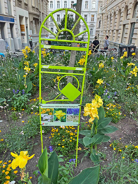 The municipality confects a planting scheme each year to offer a unified but informal vibe in public parks, from postage-stamp plots at odd-shaped street intersections to sprawling beds near the city’s grandest monuments. Last summer’s display featured a winsome quintet of gold, buff and white, accented with dabs of indigo. And here they are, the 2023 Summer Flowers of Vienna City Gardens (with the German common names in parenthesis): Bidens ferulifolia ‘Golden Empire’ (Goldmarie), Canna indica ‘Cannova Yellow’ (Blumenrohr), Gaura lindheimeri ‘Geyser White’ (Prachtkerze), Pennisetum macrourum ‘White Lancer’ (Lampenputzergras) and Salvia farinacea ‘Farina Violet’ (Mehliger Salbei).